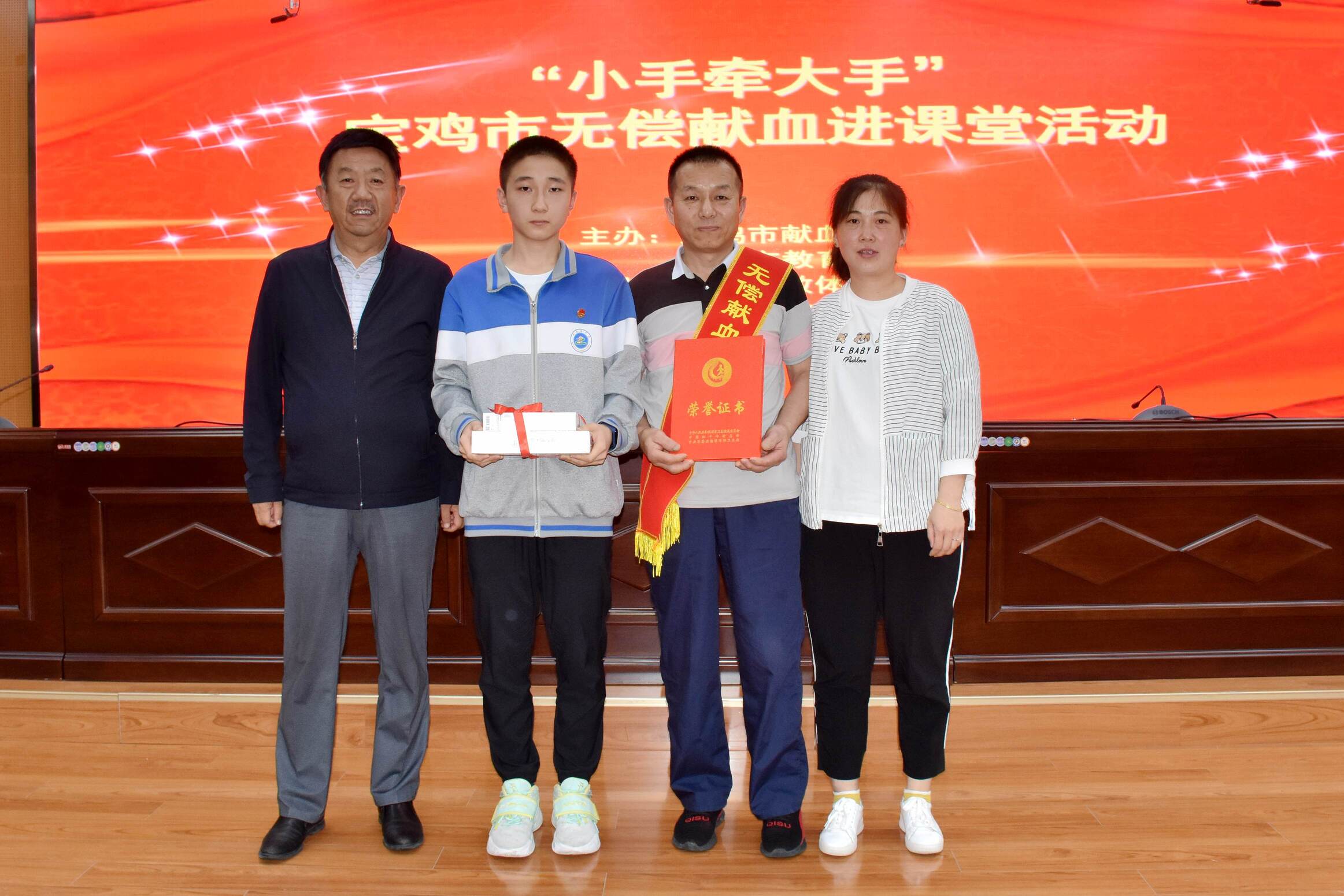 该校八年级16班的商佳琳同学现场为其父亲商云起颁发了“全国无偿献血奉献奖金奖”证书,引来全体师生的热烈掌声。祁伟森校长给商佳琳同学赠送了礼物,向他们全家表示诚挚祝贺,并同他们一起合影留念。