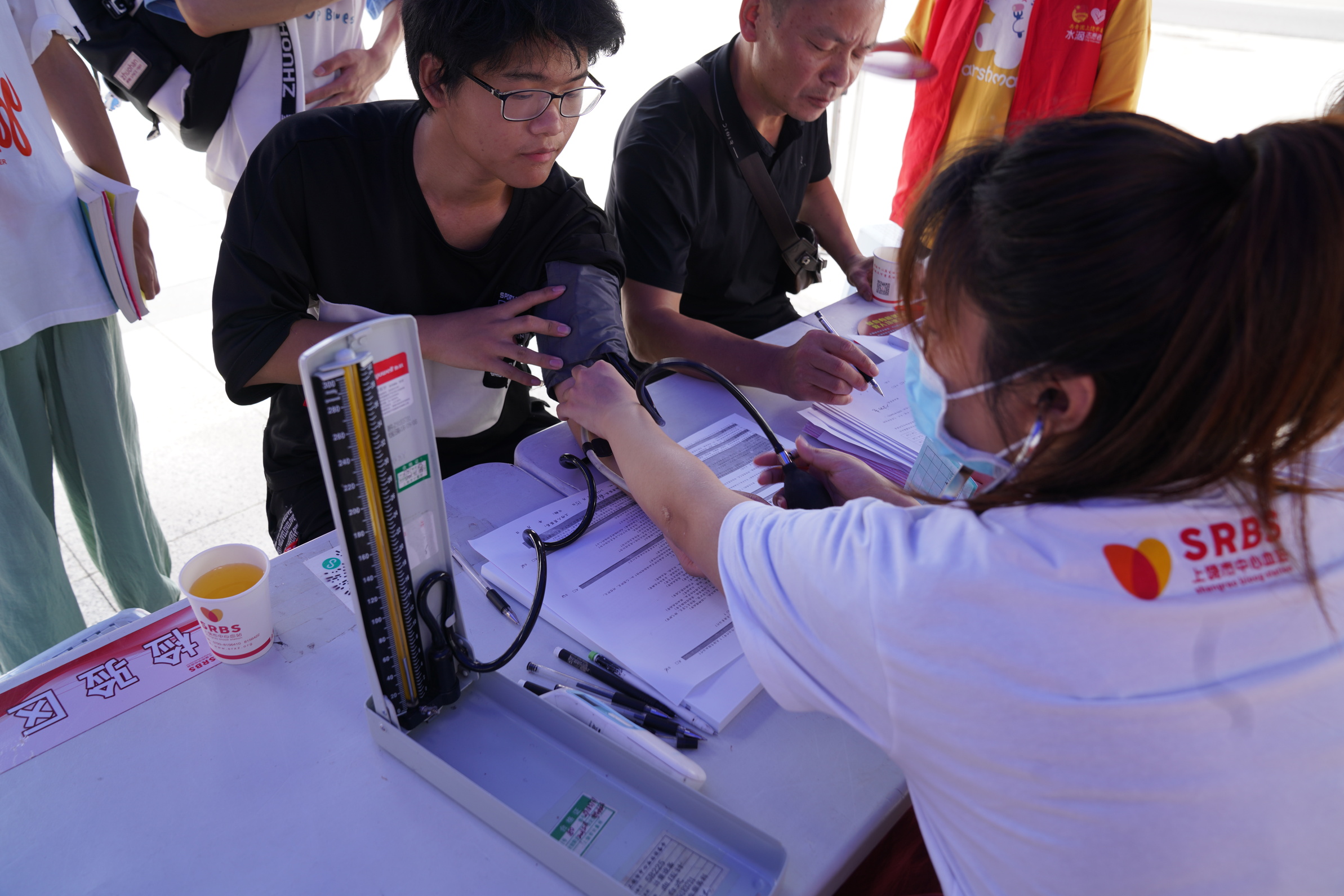 碧空如洗,只见校园各处走动着青葱少年。献血车刚一停好,就有几位校园志愿者迎了上来,开始一起帮忙搬东西。东西刚放好,几位男生立即走过来体检填表格了。