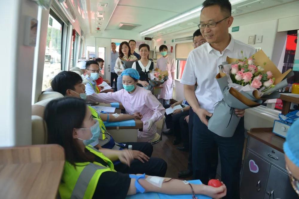授牌仪式过后,领导一行慰问了正在参与无偿献血的中建七局的员工们,并送上鲜花对他们表示感谢。
