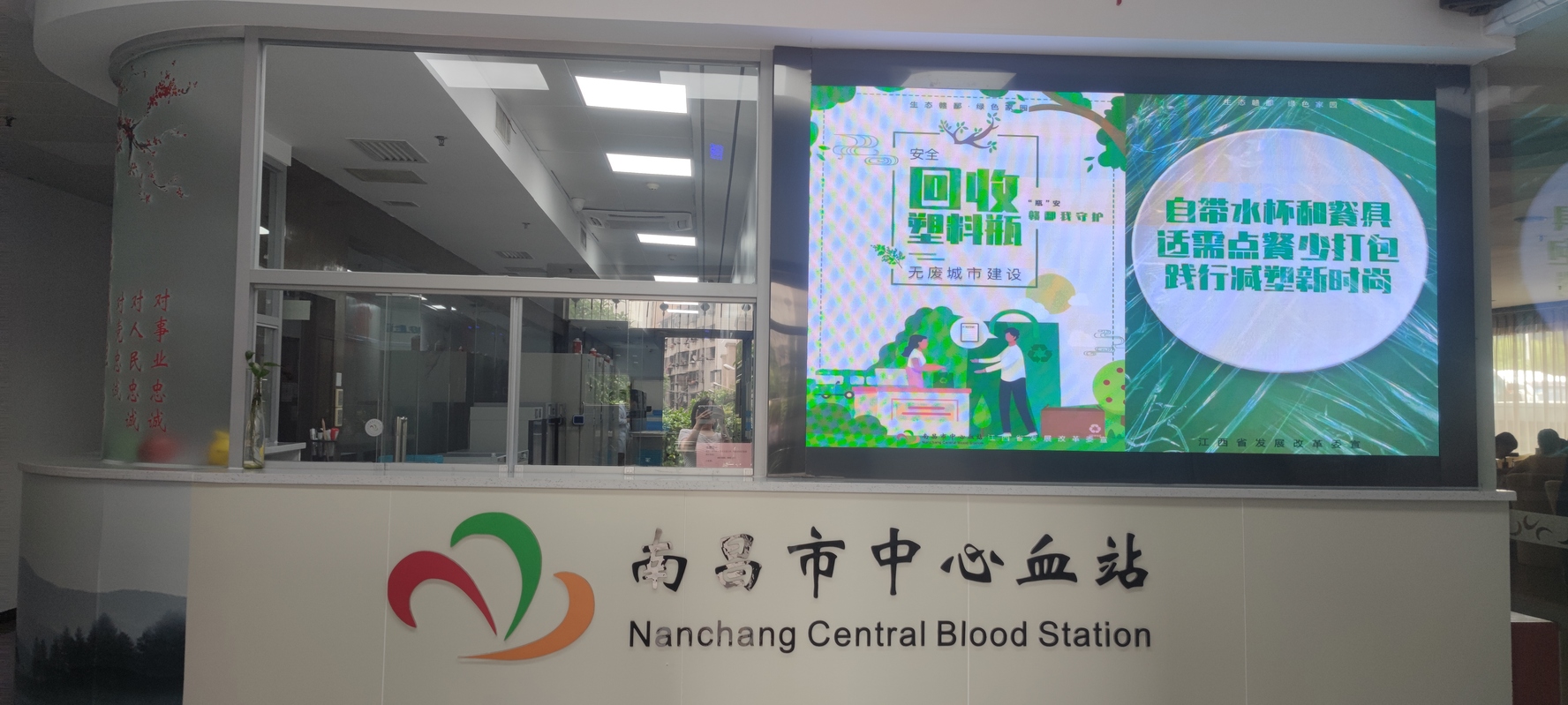 6月为江西省生态文明宣传月,为深入学习贯彻习近平生态文明思想,宣贯<<江西省生态文明建设促进条例>>,宣传我市公共机构生态文明建设成效,普及生态文明知识,弘扬生态文化,倡导生态文明行为,提高广大干部职工的生态文明意识,开展了以“践行绿色发展 弘扬绿色文化”的生态文明宣传月活动。利用站职工微信群号召全站职工积极参与到生态文明宣传月活动中来,利用站内电子屏幕滚动播放宣传月活动主题和宣传海报, 利用各外采点电子屏幕向社会各界无偿献血者宣传