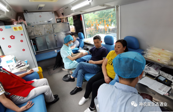 公司支部积极分子赵礼明跨步从采血车出来,同事便开玩笑说:“你身壮如牛,今天抽了几斤?”“神农架酒天天喝,血年年献”,赵礼明朗声回答,引起现场哄堂大笑。