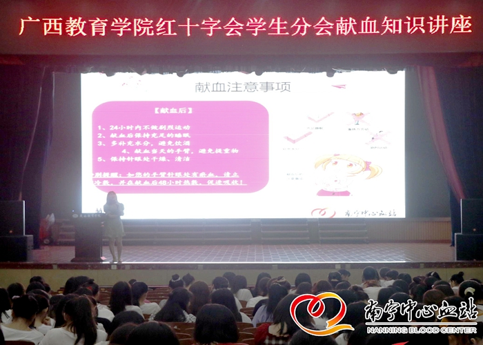 6月25日,南宁中心血站联合广西教育学院在该校礼堂举办无偿献血知识讲座,共近400名同学参加。讲座为向当代大学生普及无偿献血知识,鼓励更多大学生了解和支持无偿献血事业。
