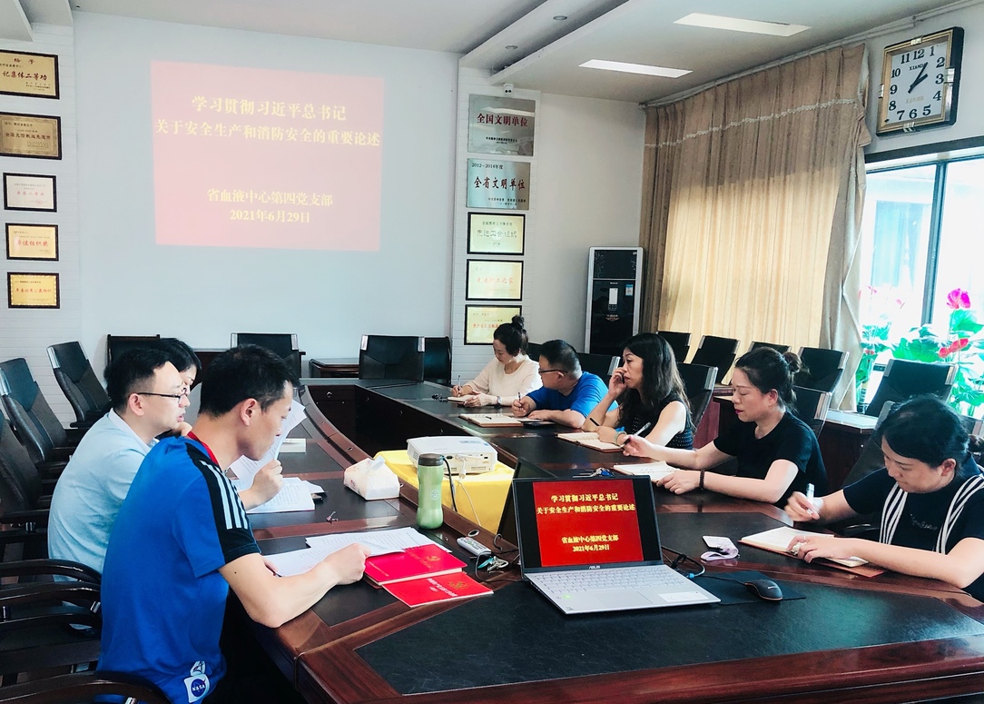 为庆祝中国共产党成立100周年,深入推进党史学习教育,不断增强支部党员职工的安全生产意识,切实把安全发展理念压实压牢,在省血液中心第四党支部6月29日的支部党员大会上,专题学习了习近平总书记关于安全生产和消防安全的重要论述。