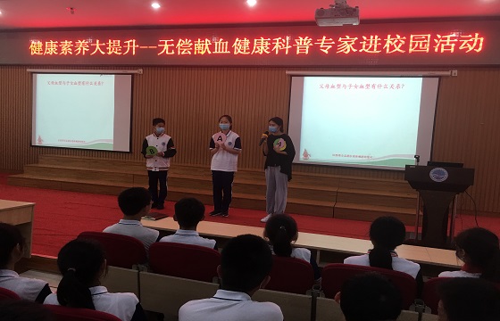 以提升全市居民健康素养水平为目标,以健康教育和健康促进为重点,引导市民树立“无偿献血、助人利己”的科学理念,青岛市中心血站再次举行了健康素养大提升——无偿献血健康科普进校园活动,6月28号下午,无偿献血健康科普走进青岛三十九中市北分校。