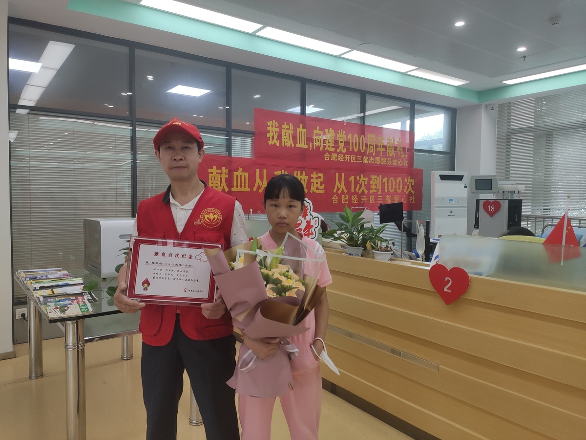 7月1日,建党一百周年,安徽省血液中心的单采大厅出现了一大一小两个熟悉的身影,徐继胜和他的女儿。徐继胜默默地走向熟悉的位置,开始排队、填表、化验、采血,穿着粉色衣服的小女孩便静静地坐在休息室椅子上等待。为了捐献热血救人,献礼建党一百周年,徐继胜特地申请调休,一大早赶到血站捐献血小板。