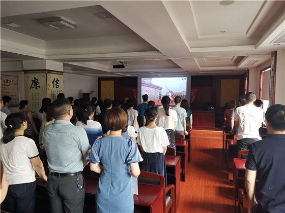 (血站领导班子带领全体人员肃立,收看直播升旗仪式)