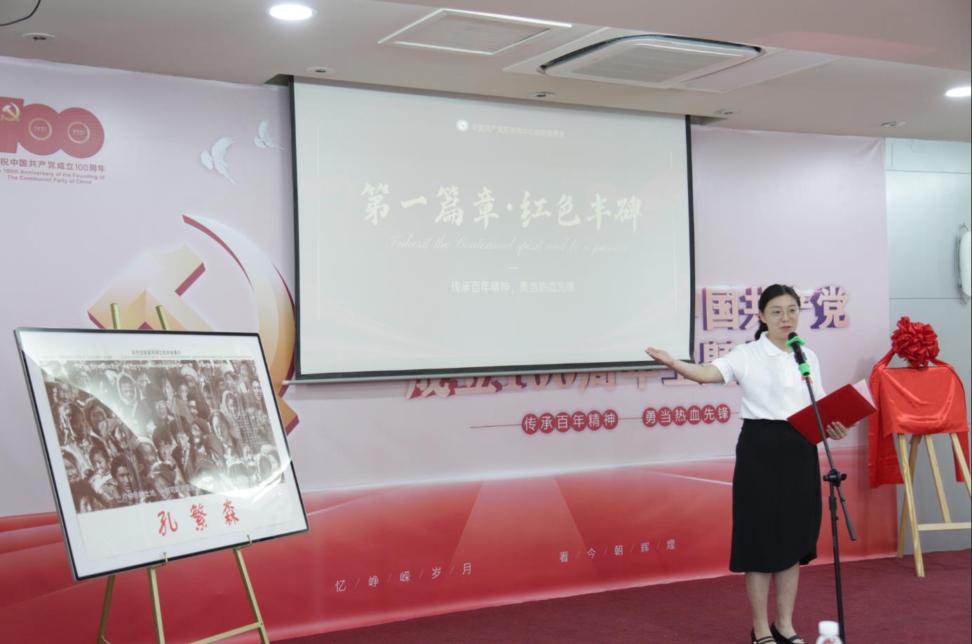 在当天会场外的走廊上,庆祝中国共产党建党100周年的红色电影海报展吸引了大家驻足欣赏。党员王仪含同志动情地为大家讲述电影《孔繁森》背后的故事。