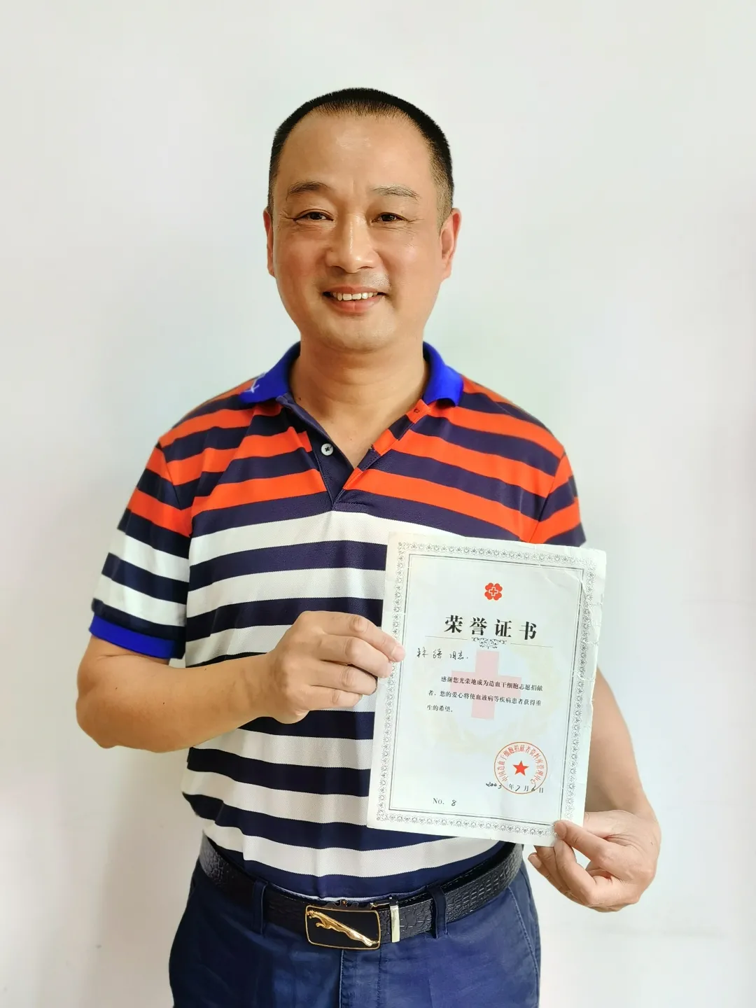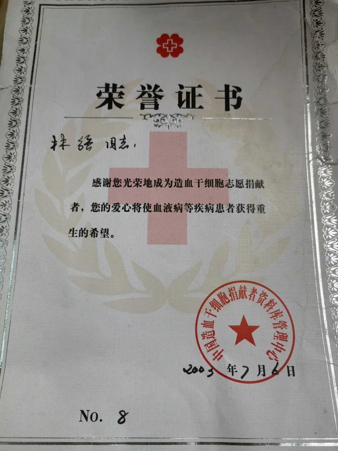 这一次,舅舅又动员林强参加。听说捐献造血干细胞能让白血病患者重获新生,林强再一次站了出来,成为福建省第一批捐献造血干细胞的志愿者,并获得了一张编号为“8”的荣耀证书。这么靠前的数字,让他感到十分自豪。