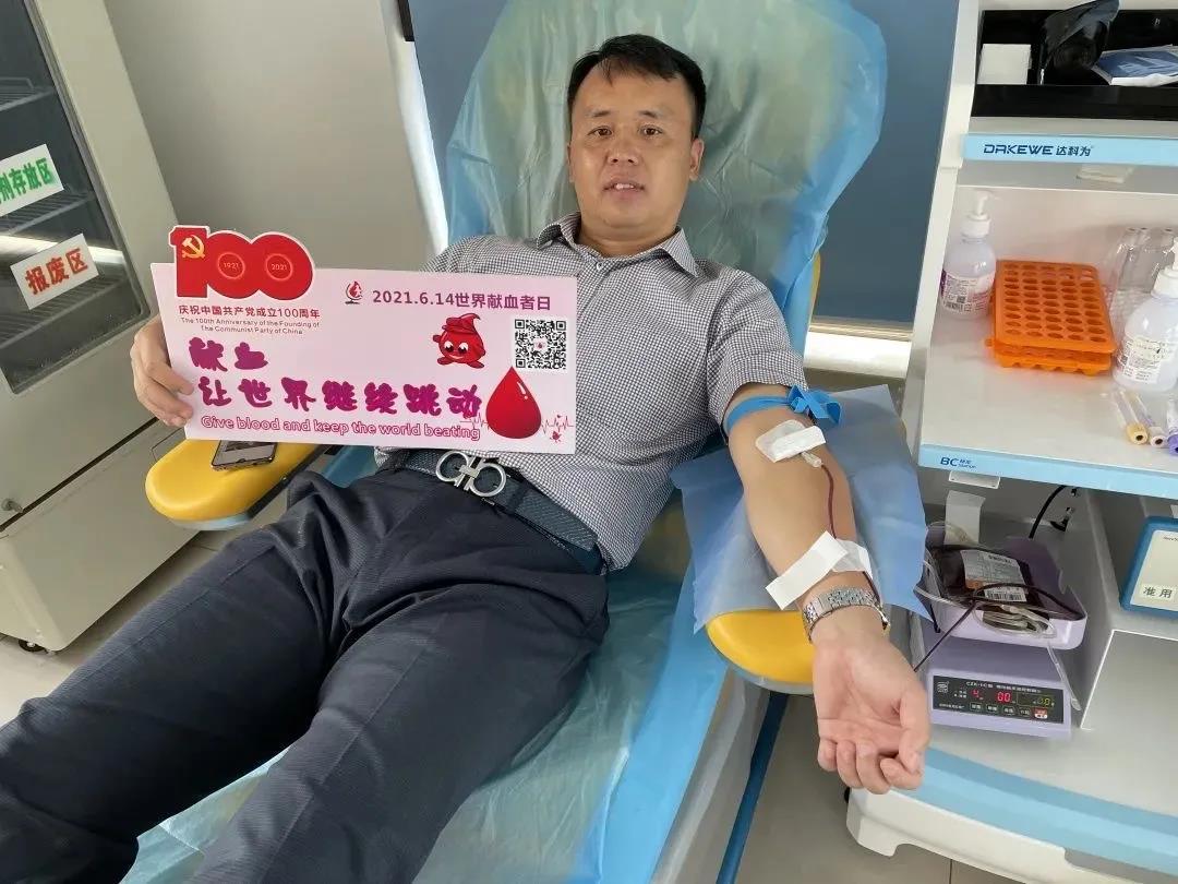 杨宝敬在无偿献血时激动地说:“在今天这个载入史册的日子里,我捐献热血,为党旗添彩,为党庆祝生日,是我作为一名党员最激动的时刻!”