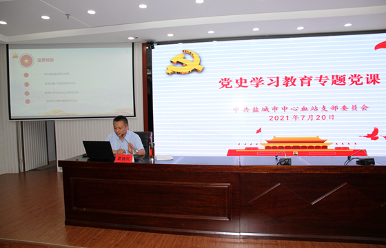7月20日下午,盐城市中心血站开展党史学习教育专题党课活动,站领导班子成员、中层干部和全体党员参加了活动。