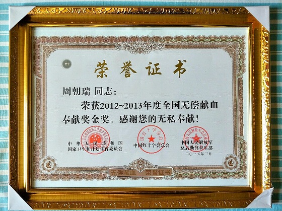 自2013年至今,周朝瑞同志参加志愿服务活动的时间累计将近300个小时。不仅如此,为了吸引和带动更多的人加入到无偿献血奉献爱心的队伍中来,他坚持参加无偿献血三十多年,从未间断。凭借“近水楼台”的优势,至今已累积捐献全血46次,共计16000毫升,荣获“全国无偿献血奉献奖金奖”。