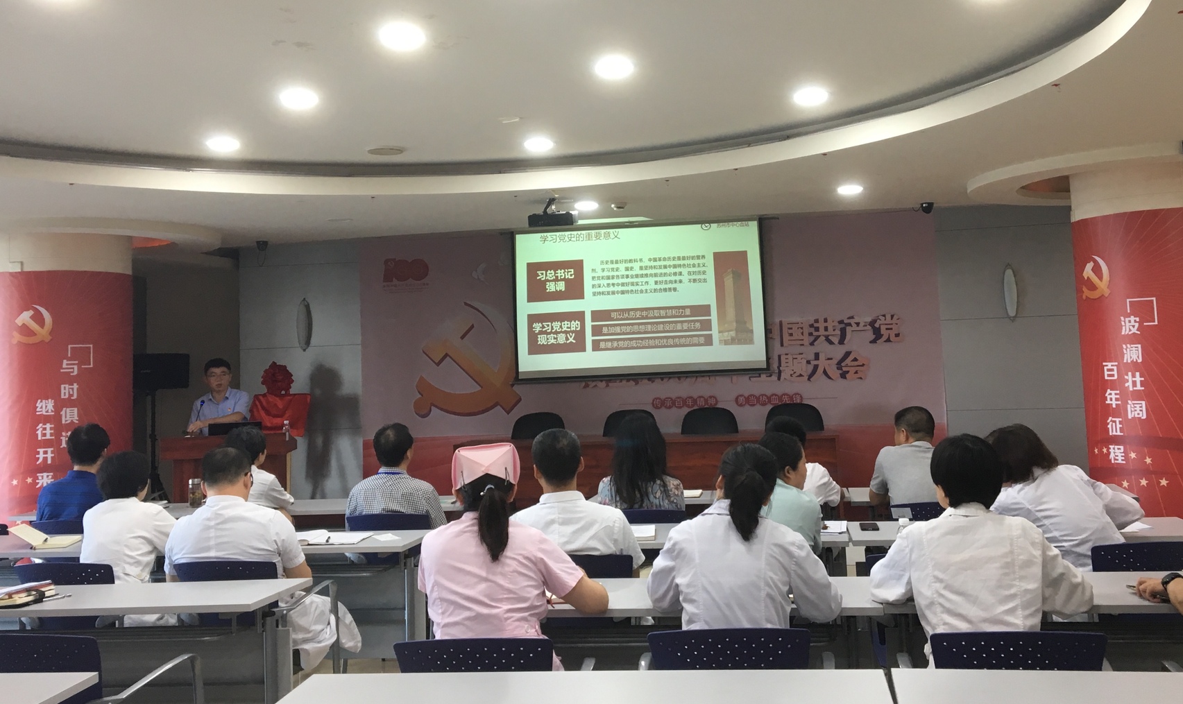 为深入推进党史学习教育,从党的百年历史中汲取智慧和力量,激发党员干部干事创业的精气神,7月19日下午,苏州市中心血站党委书记、站长严伟斌同志以《学光辉历史,做热血先锋》为题,从“党史发展的脉络”、“将学习成果应用到实际”两个方面,为全站党员讲了一堂深刻而又生动的党史专题党课。