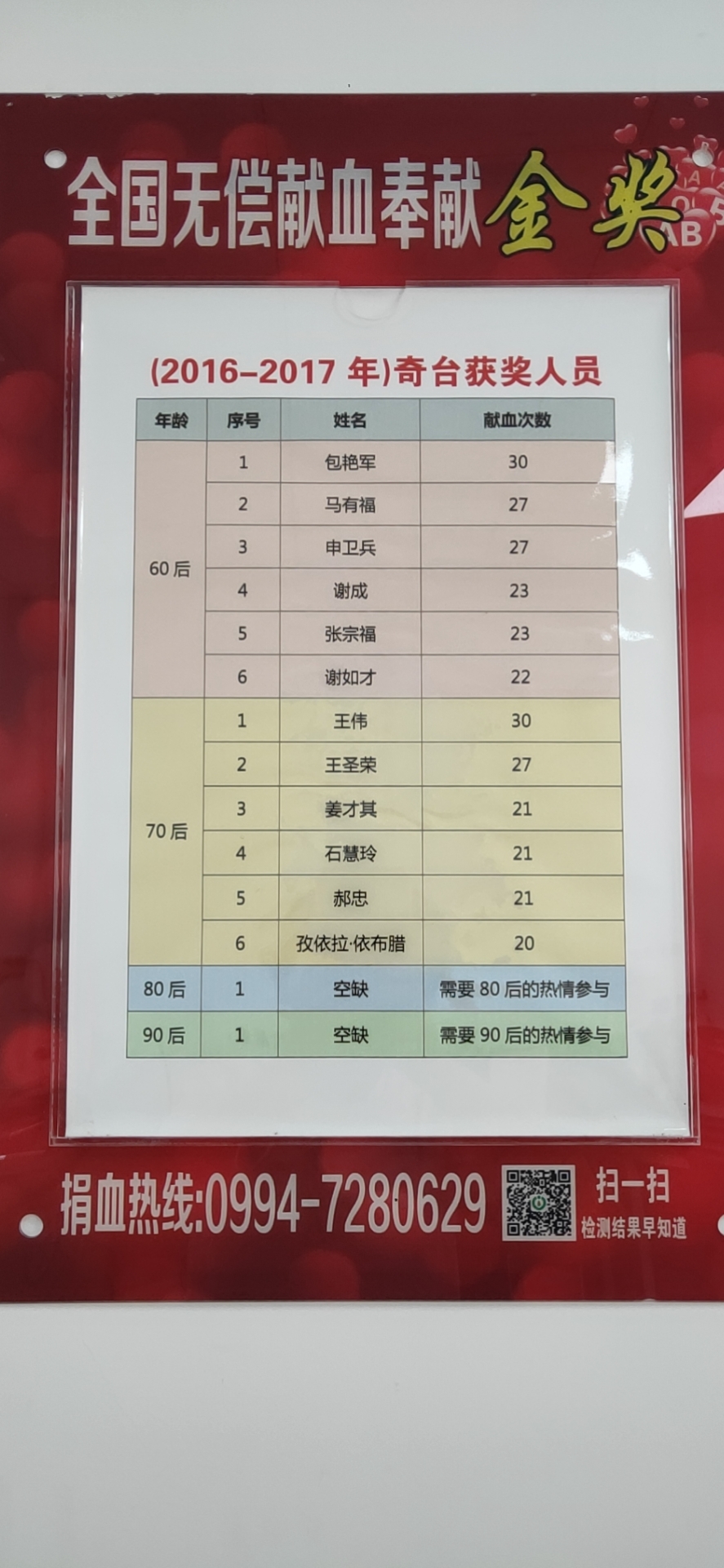 2021年6月10日当他再次走进献血屋,不在像以往那般平静,他的目光直接投入到献血大厅的光荣榜上,几秒钟后他自言自语感叹道“能献血的机会越来越少了!”这时他的名字已出现在60后荣获“2016-2017年度全国无偿献血奉献奖金奖”的名单里。