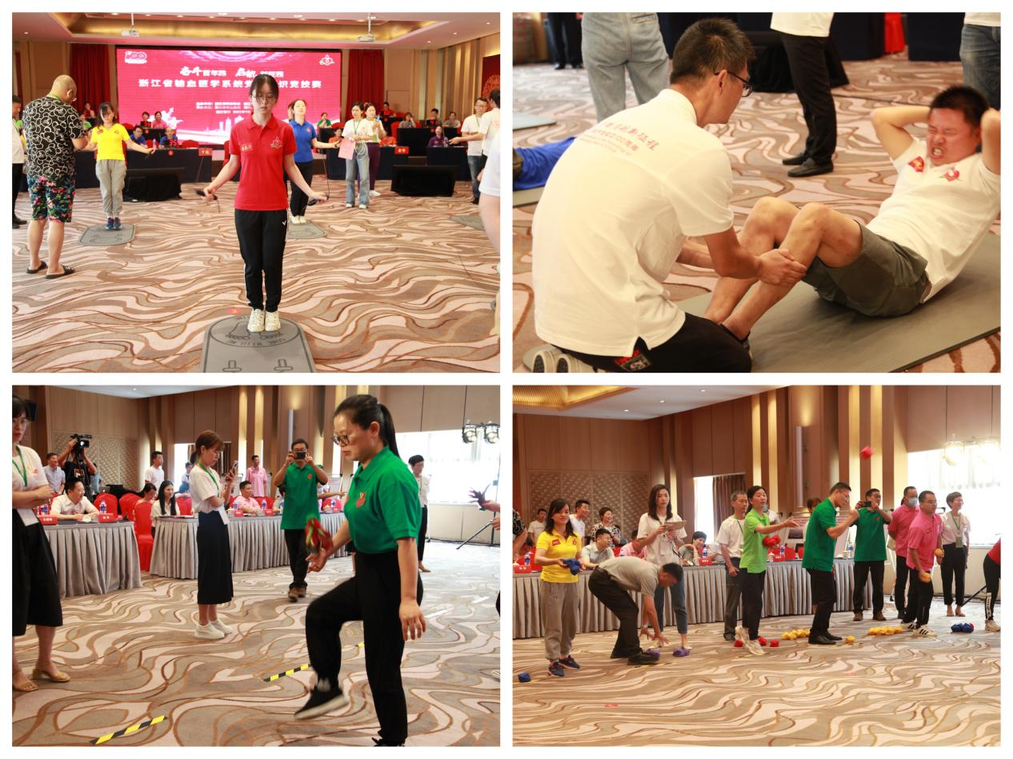 本次党史竞技赛包含知识竞赛和体育竞技两类项目,知识答题以党史、新中国史、改革开放史、社会主义发展史为主,体育竞技包括“高速飞转”(单人跳绳)、“精准打击”(投掷沙包)、“卧薪尝胆”(仰卧起坐)、“再创新高”(踢毽子)等四个项目。知识竞赛和体育竞技为单独一轮,两者交替进行,每轮11支队伍同时竞技。赛场上,选手们斗志昂扬、意气风发,你追我赶、以赛促学,竞赛现场气氛紧张而热烈,展示了扎实的党史知识储备和拼搏的竞技风采。经过激烈角逐,温州、嘉兴代表队获一等奖,金华、省直、衢州、湖州代表队获二等奖,丽水、台州、宁波、绍兴、杭州代表队获三等奖。最后,分别对前期开展的浙江省输血医学系统“费森尤斯卡比杯”庆祝建党100周年摄影、征文比赛获奖代表,以及浙江省输血系统“奋斗百年路 启航新征程”党史竞技赛获奖代表队进行颁奖。