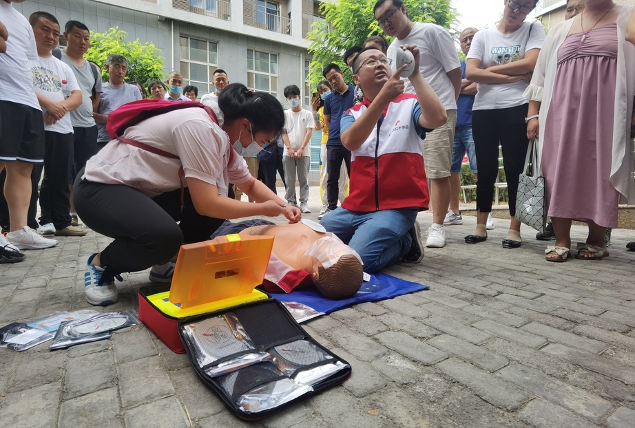 在分组操作演练环节,金凤区红十字会专家结合急救道具,就急救部位、首发、步骤、话术及其要领进行现场示范。邀请志愿者以互动的形式,实地感受急救过程并掌握基本操作技能。志愿者在专家的带领下,体验心肺复苏术(CPR)、人工呼吸、自动体外除颤仪(AED)等技能及设备的操作方式和流程。