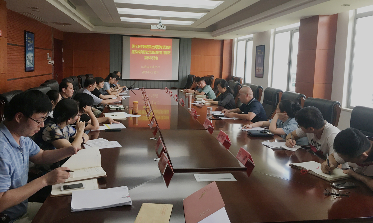 为进一步强化正风肃纪,增强党员干部政治自觉和廉洁自律意识,筑牢拒腐防变思想防线,根据上级要求和中心党委廉政教育月、医疗卫生领域突出问题专项治理工作的统一部署,7月26日下午,江西省血液中心召开医疗卫生领域突出问题专项治理廉政教育暨党风廉政建设宣传教育月集体廉政谈话会。江西省血液中心党委书记主持会议,纪委书记周冬根讲话,副主任苗燕平及全体中层干部参与会议。