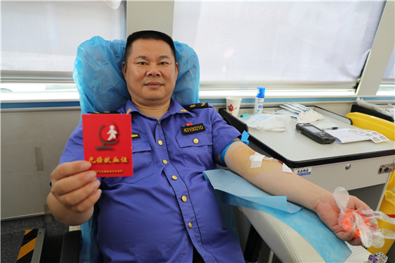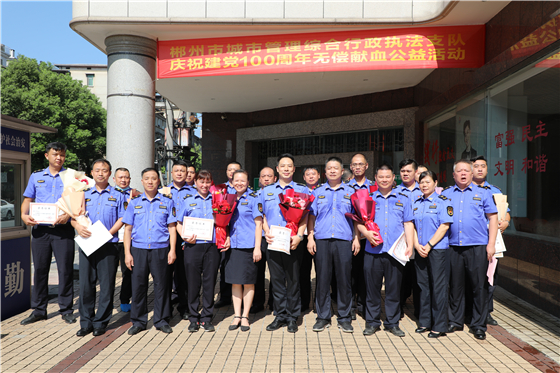 (市城市管理综合行政执法支队苏仙大队大队长李发善带头献血)