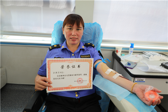 受到表彰的队员彭燕芳也毫不犹豫地加入到采血队伍。“无偿献血无损健康,又可以让更多的人得到帮助,我们应成为无偿献血行动的积极响应者,为急需用血的患者献上自己的爱心。”正在献血的彭燕芳表示,自己已经是第10次参加献血了,今后还会将这项公益事业坚持下去。
