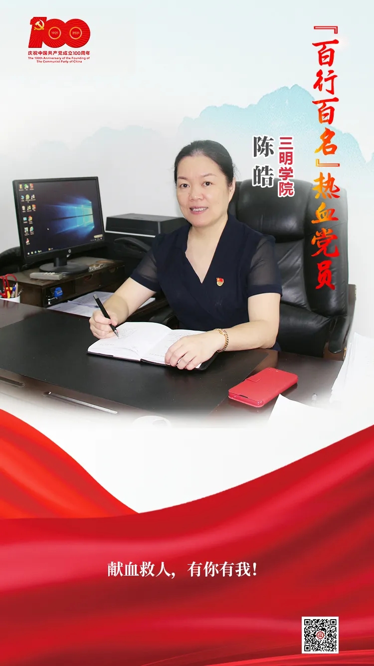 她坚持定期献血。从第一次献血至今,累计献血34次,是三明市献血协会的终生荣誉会员,分别荣获 2018—2019年度全国无偿献血奉献奖银奖、2018—2019年度全国无偿献血志愿服务奖四星级。作为一名共产党员,她用行动支持无偿献血,起表率作用,做奉献的楷模。