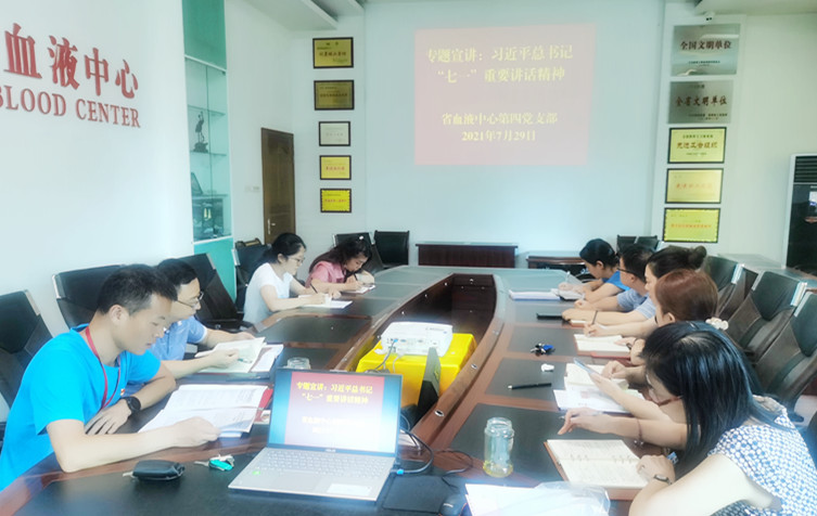 2021年7月29日,第四党支部召开党员大会暨党史学习教育专题组织生活会集中学习,支部书记杨健主持会议并对习近平总书记在庆祝中国共产党成立100周年大会上的重要讲话作专题宣讲。
