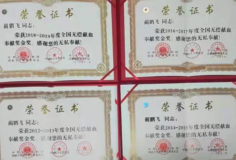 在日常,蔺鹏飞就积极参加慈善活动,不仅捐钱、捐物,还积极参加无偿献血。从2003年到现在,蔺鹏飞坚持无偿献血18年,献血140次4次荣获全国无偿献血奉献奖金奖。