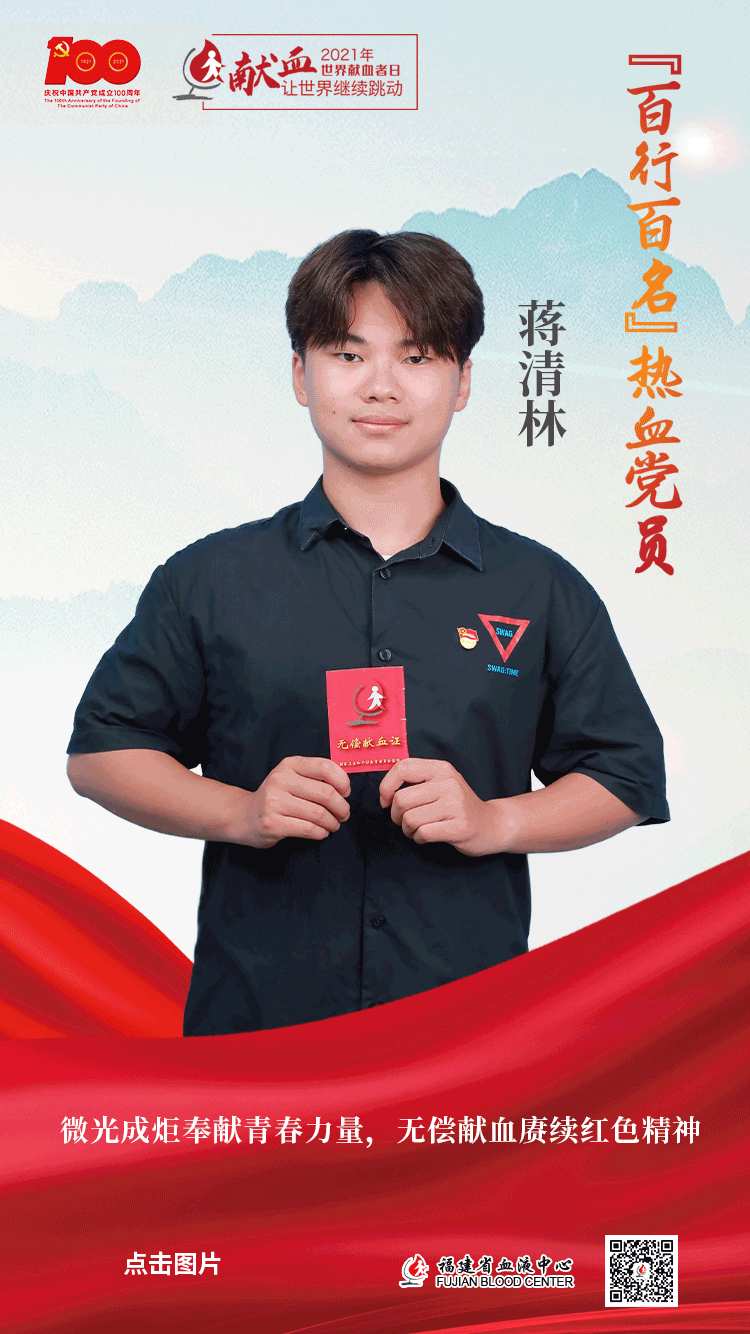 福州大学人文社会科学学院学生蒋清林,既是党员又是班长的他,在同学眼中是个阳光、热情、乐于奉献的大男孩。大学期间,他捐献了3次全血和3次单采血小板,用自己的一腔热血诠释着新时代大学生的风采。
