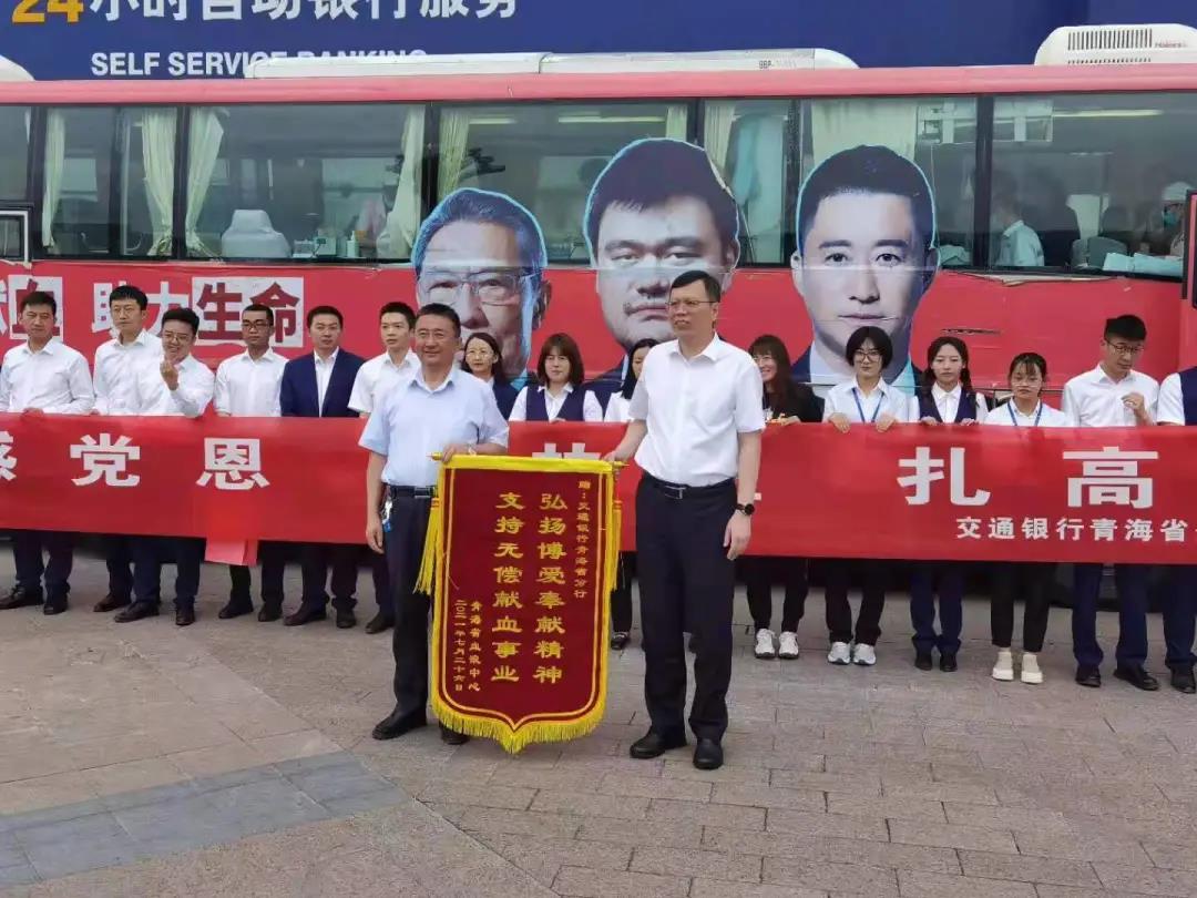青海省血液中心班子成员李向国代表中心为交通银行青海省分行赠送锦旗,感谢交行员工对无偿献血爱心事业做出的贡献。