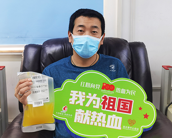 连云港中远海运特种装备制造有限公司穆传建是一位热心公益的固定无偿献血者,自2002年首次参加无偿献血以来,无偿捐献全血7900毫升。2021年8月7日上午,他应约来到连云港市中心血站机采室,第一次捐献血小板,一方面是为参加奥运会的中国队加油,同时也是为表达感恩国家给他免费接种疫苗之情,并将捐献血小板的小视频,配文 “国家送哥两针疫苗,哥捐血小板给需要的人”发布到朋友圈,现身说法,宣传无偿献血。