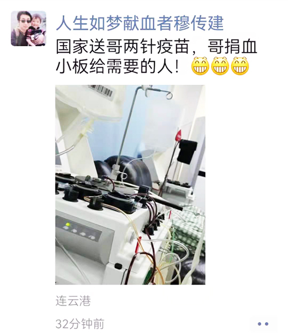图三:穆传建捐献血小板时发布的朋友圈截图。