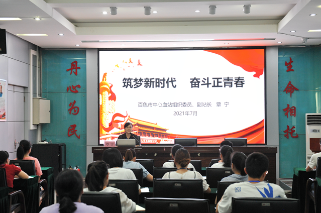 为加强团员青年的责任感和使命感,进一步激发团员青年的爱党爱国热情,将红色基因根植于心,百色市中心血站团支部于2021年8月5日开展“筑梦新时代,奋斗正青春”主题团日活动,深入推进党史学习教育,引导团员和青年干部学党史、强信念、跟党走。