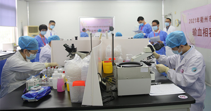 图为衢州市输血技术职业技能竞赛输血相容性检测考场