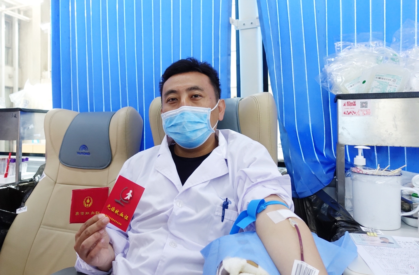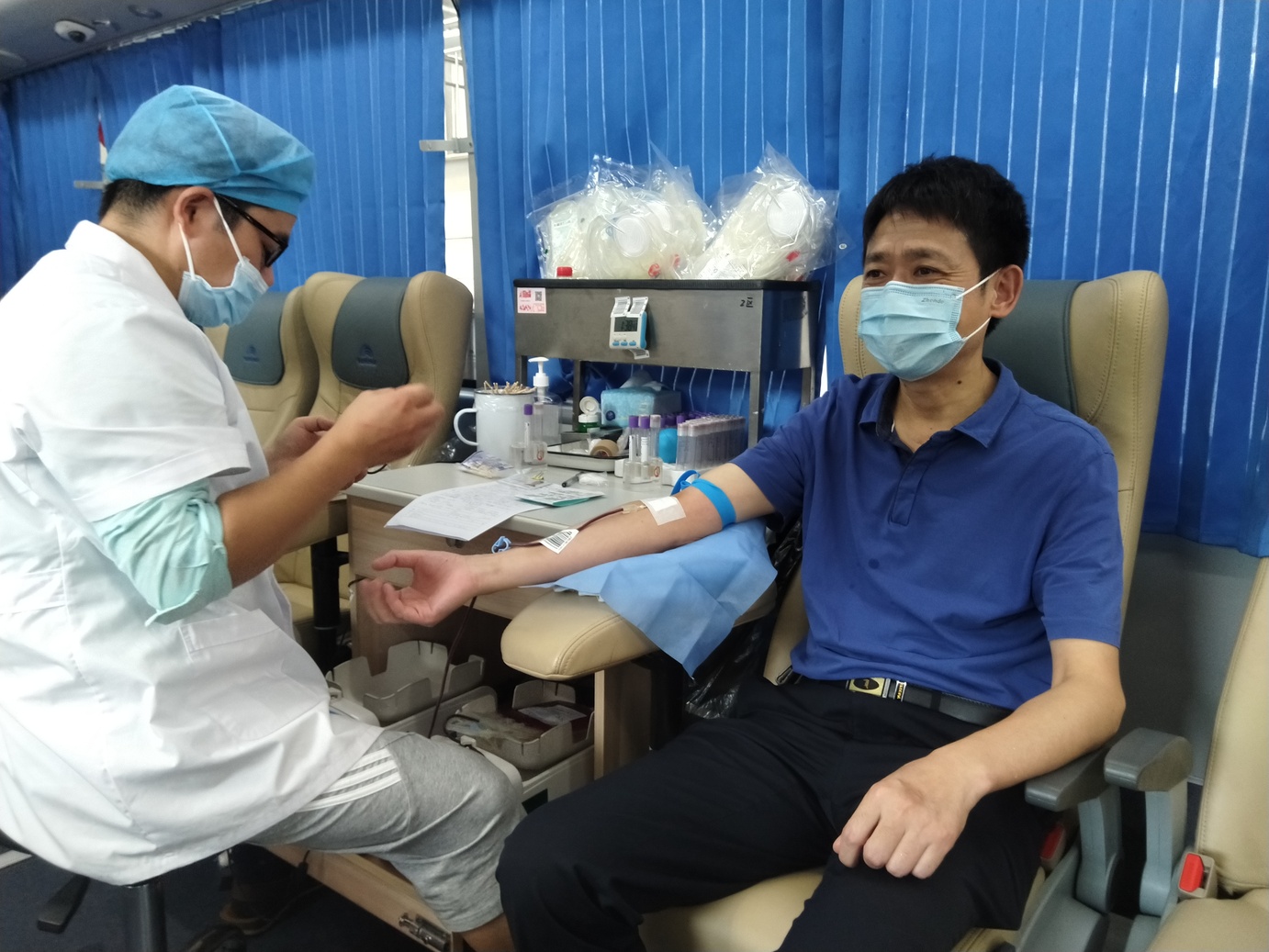 上午8时许,在献血现场,各医护工作人员按照规定的时间参加献血,每名献血志愿者在工作人员的指导下,按照流程有序地进行体温检测、填表询问、初筛检查,血液检验合格后即开始无偿献血。