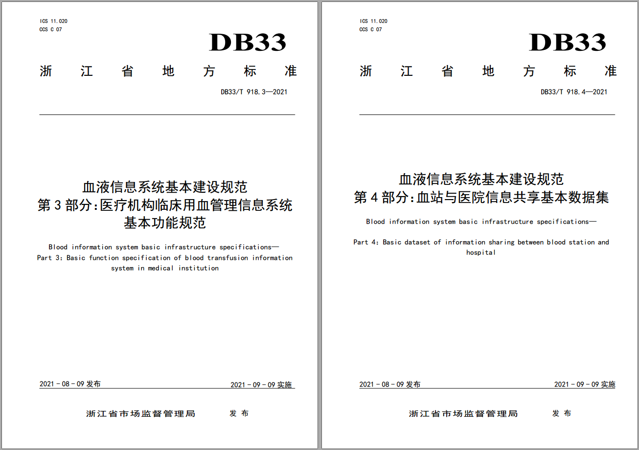 日前,浙江省市场监督管理局批准发布了两项浙江省地方标准《血液信息系统基本建设规范 第3部分:医疗机构临床用血管理信息系统基本功能规范》(DB33/T 918.3-2021)和《血液信息系统基本建设规范 第4部分:血站与医院信息共享基本数据集》(DB33/T 918.4-2021)。