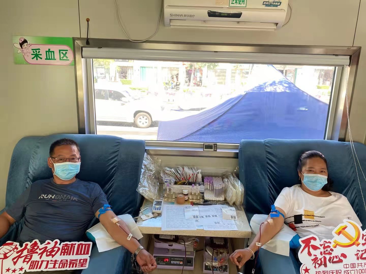 刘海山告诉我:“我们都献了好多次血了,每次都是我们俩一起来。本来今年6月14日要来的,可是我跟她都在上班,还真没时间来,今天我们都休息,就想的一定要来献个血,再加上今年是建党100周年,作为党员的我们,除了要一心向党,不忘初心,牢记使命,还要为我们群众办实事好事,献血就是我们可以做的力所能及的事情”。