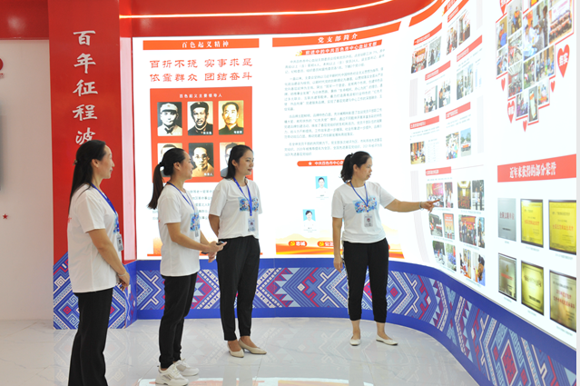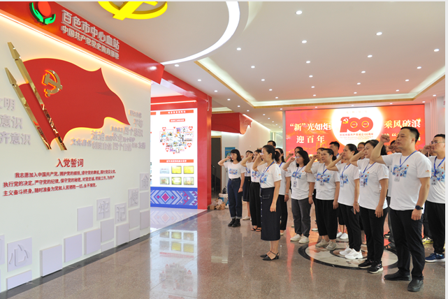 基地由“党的光辉历程100年”、“百色起义精神”、“血站发展史”、“支部简介”、“党员风采”等多个部分组成。在讲解员的带领下,大家先重温了入党誓词,然后通过图片了解党的发展史,一起回顾建党100年来,中国人民在中国共产党领导下进行革命建设和改革开放的伟大事业和奋斗历程。在百色这片红色热土上,邓小平、张云逸等革命家组织领导的百色武装起义威震南疆,在中国革命史上留下了光辉的一页。