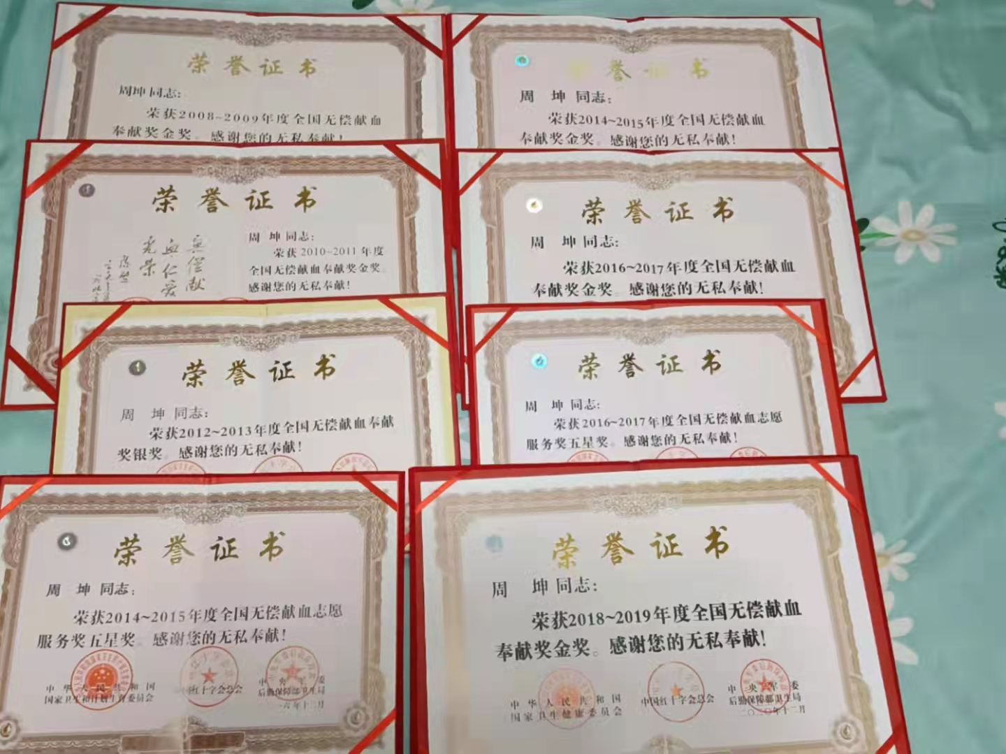 谈起第一次献血的经历,周坤印象很深刻,2000年,周坤在南京打工。有一次周末,外公去看望他,他和外公在南京街头散步,外公是一名村干部也是一名老共产党员,他鼓励周坤要参与到为人民服务的工作中去,曾经有过晕血经历的他有了外公的鼓励,周坤再次鼓起勇气走上献血车,“志愿者告诉我,无偿献血对身体无害,而且可以帮助他人。”周坤第一次献了200毫升全血。从此,周坤的打工之路,也成了他的无偿献血公益之路,虽然辗转多地,但每到一个地方,周坤都会去血站“报到”,南京、杭州、合肥等地的血站都留下了周坤的脚印、也留下了他的爱心和热血。