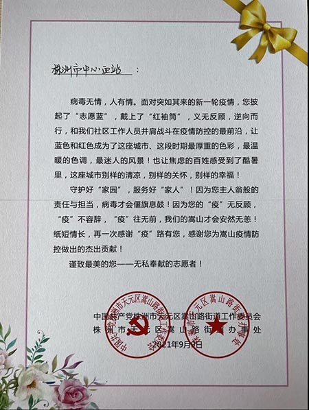 病毒无情,人间有爱。面对株洲疫情防控严峻形势,中心血站主动作为,捐献抗疫物资、消毒用品,组织党员、团员配合社区开展疫情防控工作。疫情期间,16名血站同志不畏困难,先后深入社区,协助社区为居民进行核酸检测、为居家隔离市民做心理疏导等工作,充分发挥了党员先锋模范作用,传递了社会正能量,受到了辖区居民的一致好评。