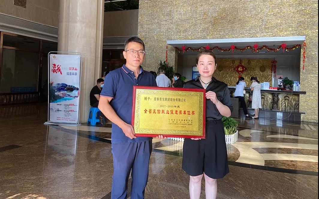 9时许,宜春市中心血站负责人袁小玲专程来到活动现场,向青龙集团颁授由江西省卫生健康委等三部门联合颁发的“2017—2019年度全省无偿献血促进奖单位奖”荣誉牌匾,对青龙集团全体员工十多年来支持无偿献血事业表示衷心的感谢。青龙集团负责人表示,“作为一名青龙人,无偿献血责无旁贷,为无偿献血公益事业贡献力量!一代人有一代人的担当,我们要在社会有需要的时候,奋勇当先”。