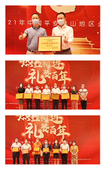 佛山市中心血站对推动无偿献血有突出贡献的中国平安佛山地区各专业公司颁发了“2020年度佛山市无偿献血促进奖(单位奖)”奖牌,并对无偿献血有突出贡献的平安员工及代理人授予“佛山市无偿献血先进个人”称号及颁发奖牌。