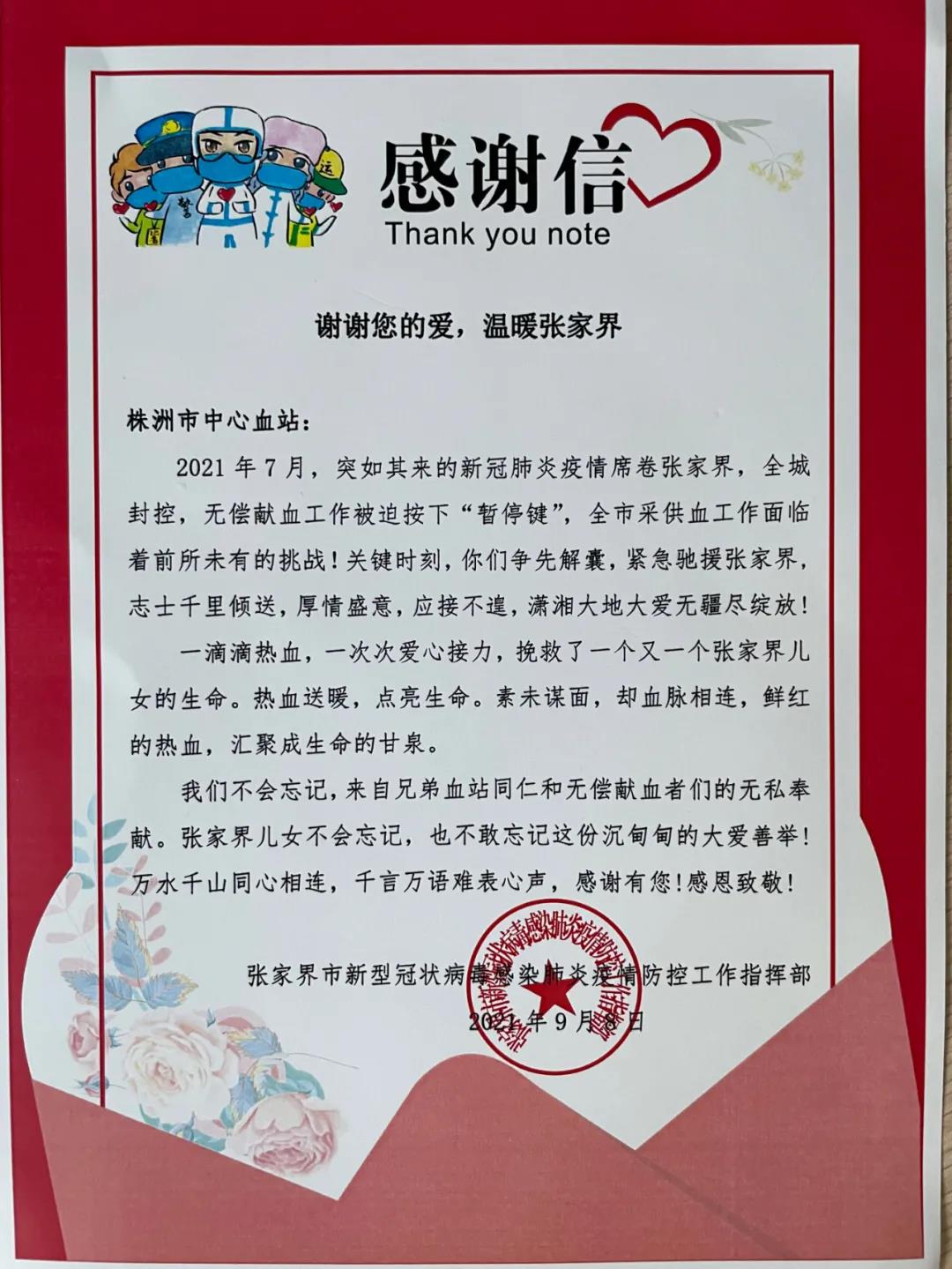 就在今天,市中心血站收到了来自张家界的一封感谢信。今年8月,为支援张家界新冠肺炎疫情防控工作,市中心血站紧急增援新冠肺炎康复者恢复期血浆600毫升,这些血浆被送往临床一线,救治危重症患者,实现了爱心延续和生命接力。据统计,自2020年新冠肺炎疫情以来,株洲市已有9名新冠肺炎康复者捐献血浆,累计采集储备恢复期血浆3600毫升。