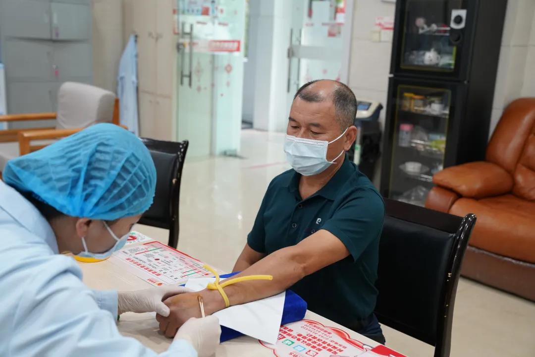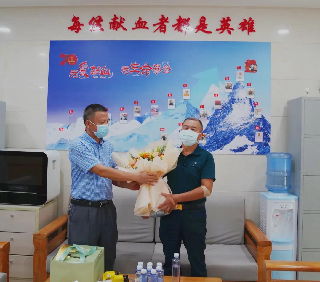 最后,黄武根献血完毕,血站领导汤仁礼向他献上了鲜花,感谢他多年为血站传递正能量,捐献一生热血。