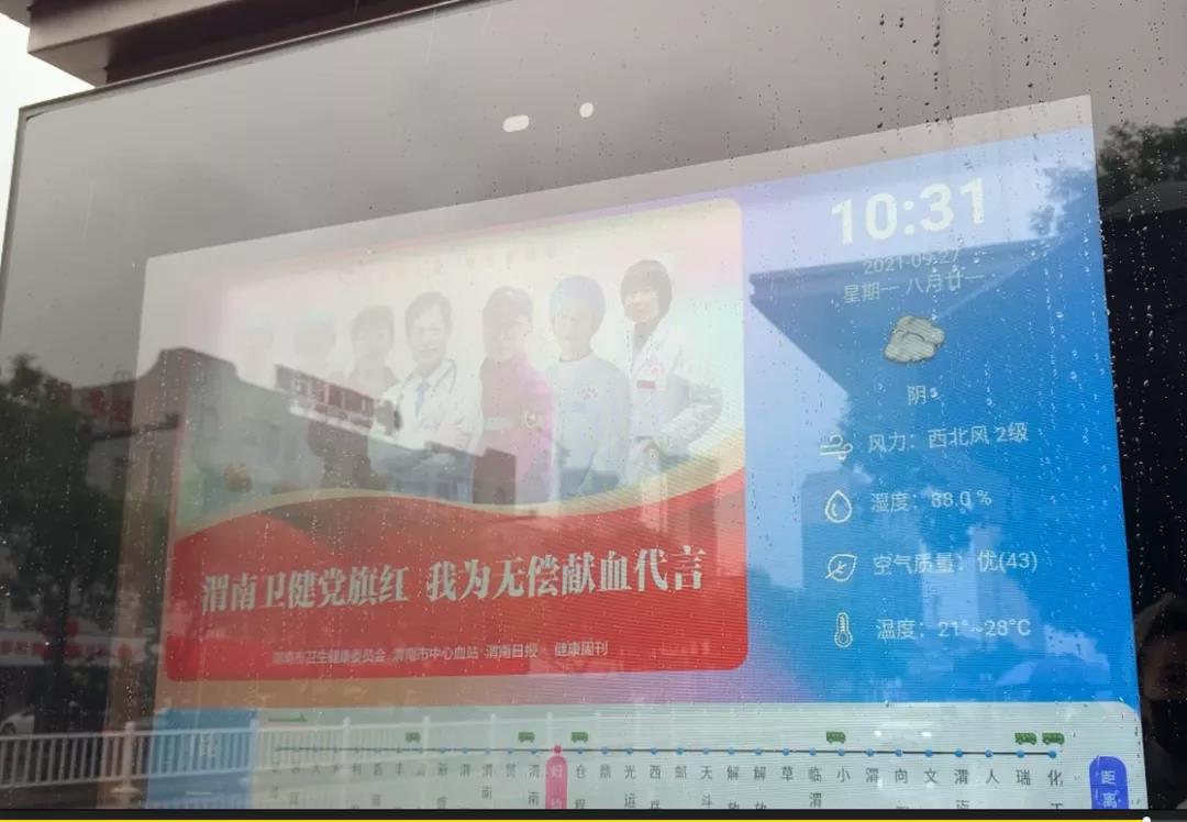 城市公交既是与市民接触密切的交通工具,也是城市文明程度的一张“名片”。为进一步拓宽无偿献血宣传渠道,提高市民无偿献血知识知晓率,近日,无偿献血宣传主题电子海报在渭南城区各公交电子站牌里亮相,市民在等待公交的同时可以知晓参与献血的途径,接受无偿献血利国利民利己这一观念。