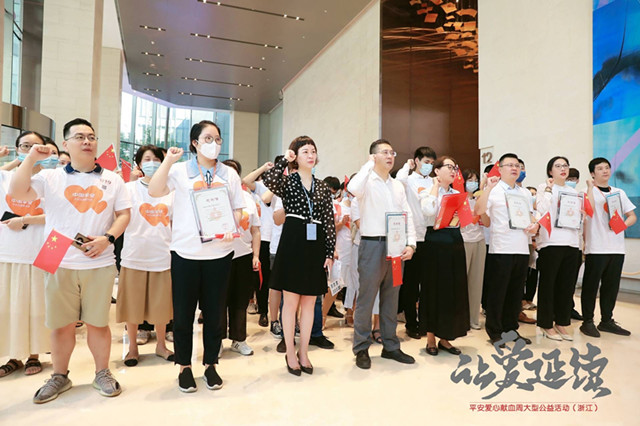 庆国庆献热血,献国礼传递爱。9月29日上午9点,2021年 “让爱延续”中国平安国庆爱心献血周活动在杭州平安金融中心再次启动,来自中国平安志愿者协会浙江地区分会的志愿者们纷纷挽袖献血,拉开了活动的序幕。来自中国平安的100余位志愿者参加了本次活动。