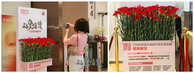 浪漫鲜花,送给有爱的您。为营造良好的献血氛围,感谢大家的爱心奉献,平安人寿浙江分公司还在活动现场特别布置了鲜花展架,每一位参与献血活动的平安志愿者在奉献爱心的同时还可额外获得一支鲜花,这也充分体现了“奉献爱心 手留余香”的公益理念。