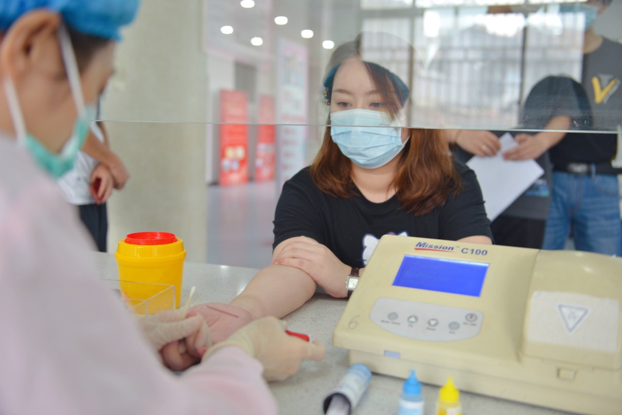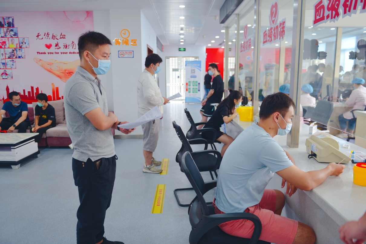 在现场志愿者的引导下,参与献血的青年员工有序地进行填表、体检、登记和抽血。