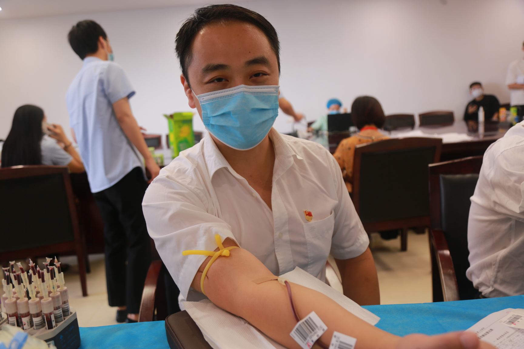 活动现场还有一位“铁杆”献血者蔡劲,他是一名共产党员,虽然他从大悟乡镇到县里再到孝感,工作岗位在变化,但8年来一直坚持献血,累计4500毫升,他用一名共产党员的执着和奉献践行了入党的初心。