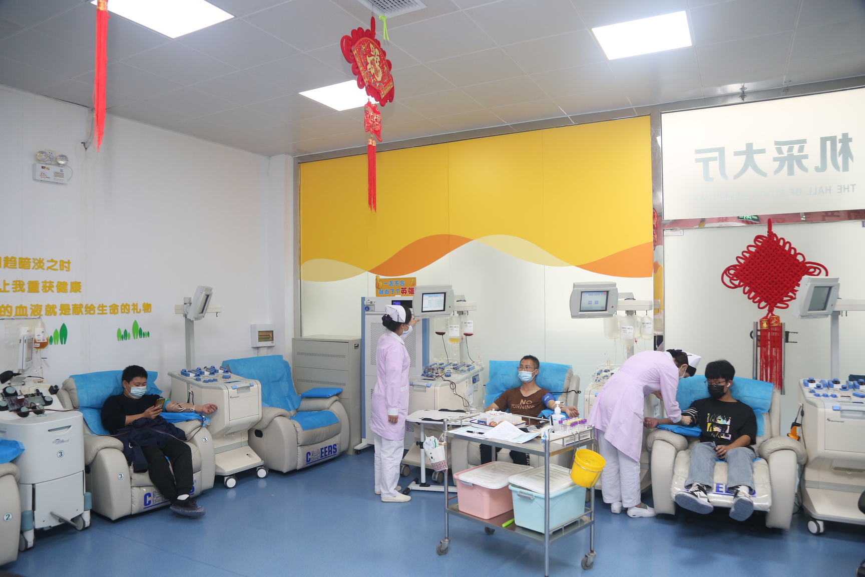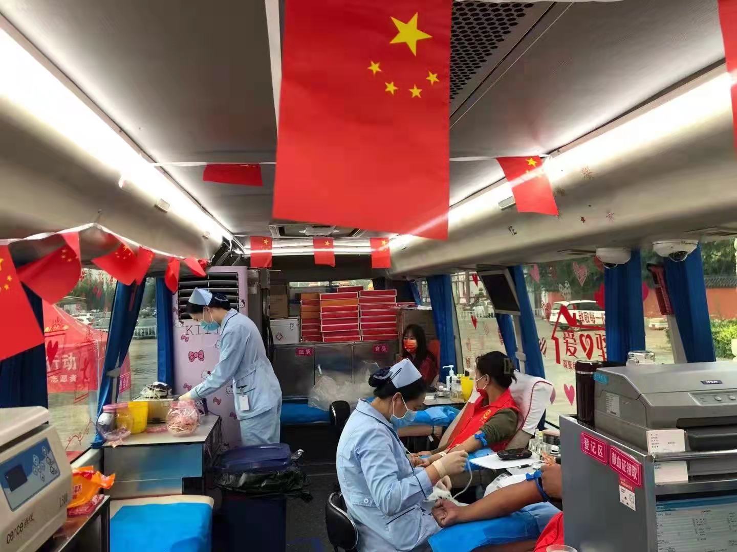 为了保障好国庆假期献血的大流量,放假第一天,采血护士们提前赶到各献血点做好准备工作,各处悬挂的小国旗充分营造出了热烈喜庆的节日氛围。线上开展的“我为祖国献热血”答题为此次活动增加了趣味性,参与者在趣味答题中收获无偿献血知识。在市医院、固安、霸州、燕郊献血屋以及中心血站机采大厅里,已经有许多爱心市民和在校大学生在等候献血,他们中有些是在廊工作就地过节的新廊坊人,希望通过献血的方式为祖国母亲庆生;有些是孩子的父母,身体力行教育下一代;还有一些是资深献血达人,平均每两周就要捐献一份成分血。国庆的爱心献血屋因为充满了爱而变得拥挤,但献血者们没有怨言,耐心有序地排队、默默等待献血。
