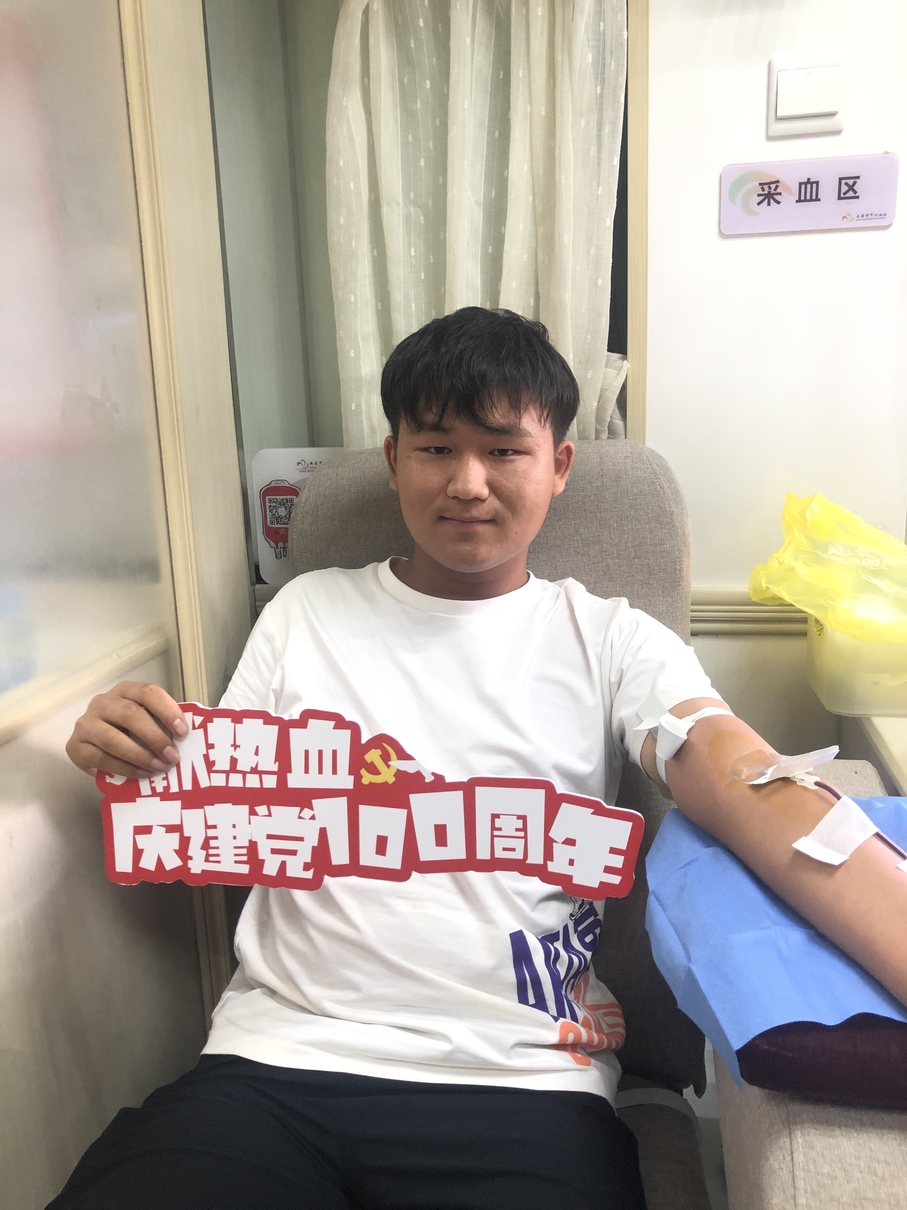 这是华东交通大学大一学生李佳豪,他第一次参加无偿献血,今天逛街看到我们献血车宣传来献血的,他说:“先烈们抛头颅洒鲜血,打破旧世界,创立了新中国;在和平建设祖国的时候,我除了努力读书报效国家,还可以用鲜红血液奉献社会。”正是这样多的正能量,为祖国的发展贡献自己的力量。