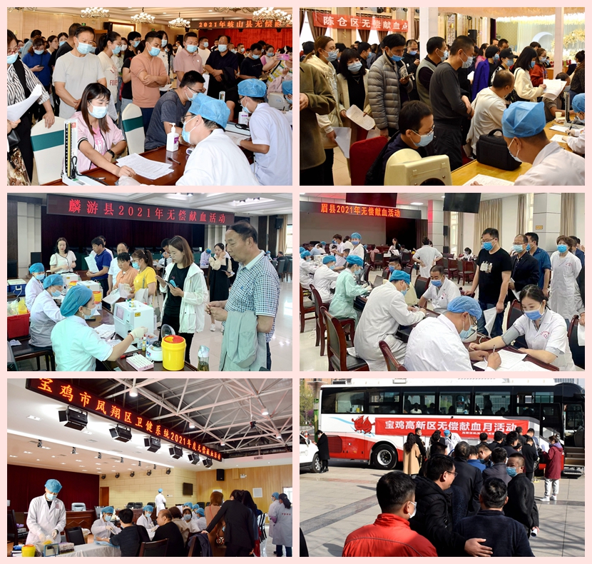 在工作中,按照市卫健委、市献血办年初安排部署,市中心血站主动加强与各县区、各应急单位和社会爱心单位、团体的沟通联系,积极协调落实年度无偿献血工作。1-9月份,岐山县、渭滨区、凤翔区、高新区、陈仓区、眉县、麟游县、太白县、凤县等县区积极响应,先后组织开展无偿献血月活动32场次,发动辖区镇街、部门、企事业单位干部职工献血4463人次126.3万毫升。市直机关工委、市公安局、市卫健委动员市级部门和系统干部职工开展无偿献血活动15场次,银保监宝鸡分局、相杨路社区、东风路社区、秦川机床公司、中铁电气装备公司、凌云电器公司、中铁宝桥公司、西电宝鸡电器厂、烽火集团、蒙牛乳业公司、秦龙出租车公司、国家广电724台、七一七总队、宝鸡文理学院、宝鸡职业技术学院、陕西振华学院和驻宝部队等组织团体献血活动22场次,累计献血3159人次89.8万毫升,对保障寒暑时节的采供血工作发挥了重要作用。