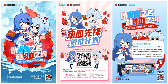 此外,本次活动与B站开展联动宣传,以B站授权的吉祥物2233娘和小电视为设计元素,设计了一组面向青年的献血宣传海报,在全省范围内开展献血倡议;设计了B站联名主题献血车,在固定献血点利用B站流行元素进行布置,打造”网红“献血点等。活动期间参与献血的青年,还可以通过“浙江献血”小程序领取B站吉祥物小电视热血祈福电子徽章。